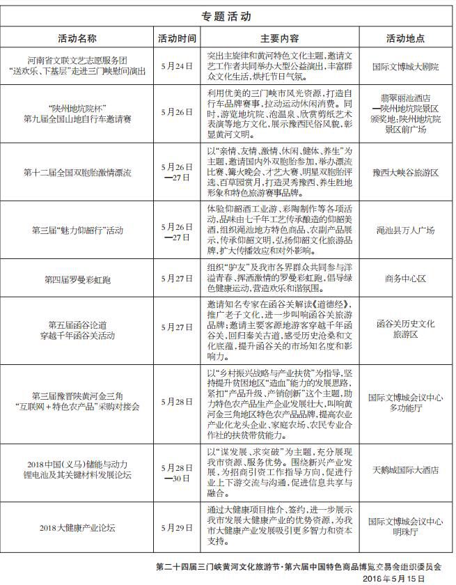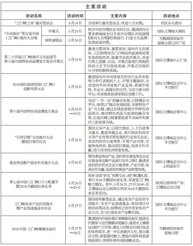 經(jīng)河南省清理和規(guī)范節(jié)慶研討會論壇活動工作領(lǐng)導小組批準同意,第二十四屆三門峽黃河文化旅游節(jié)·第六屆中國特色商品博覽交易會將于2018年5月24日—30日隆重舉行。節(jié)會共安排19項活動,其中主要活動10項,專題活動9項。