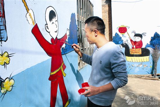 ![]() 10月29日,在湖濱區(qū)交口鄉(xiāng)北梁村,工人師傅在村口的墻上繪制圖畫。