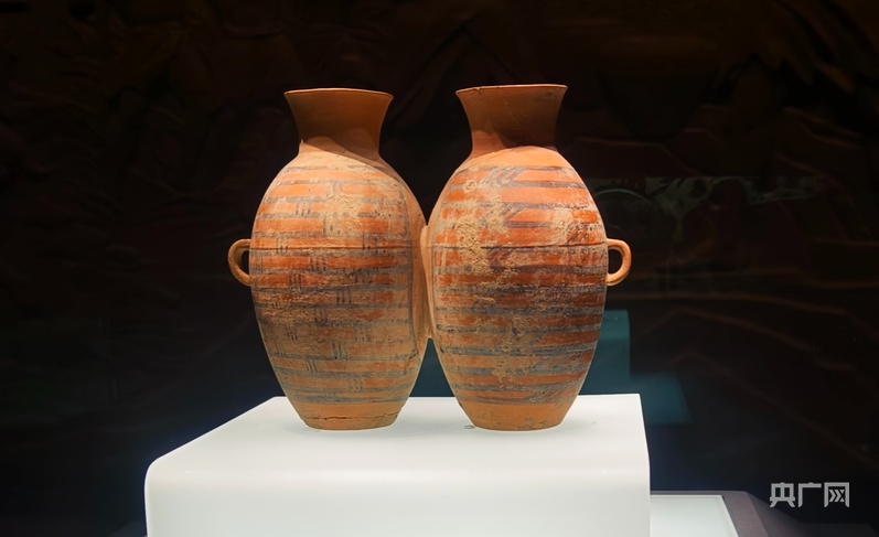 彩陶雙連壺(央廣網(wǎng)記者 郝振青 攝) 記者注意到,博物館的入口處是黃河文化主題墻,該墻以“立體拼圖”展現(xiàn)仰韶文化時期黃河流域的恢宏史詩。展廳內(nèi),1600多件(套)文物珍品從黃土深處走來,全景式呈現(xiàn)仰韶文化的考古成果與文明脈絡(luò),講述中華文明的故事。 “這是彩陶雙連壺,紅衣黑彩且形制相同的兩壺體并列連接,壺身內(nèi)腹部相接處有一橢圓形口相通,外有兩只橋形耳分飾左右。根據(jù)民族學(xué)家考證結(jié)果,這個壺是一件禮器。”講解員劉津岑介紹,這種飲酒器皿在當(dāng)今少數(shù)民族使用中仍有沿用,兩人各銜一壺同時飲用,以作友好、團(tuán)結(jié)、聯(lián)合及愛情的象征。 豐富多彩的紋飾,記錄下了先民們的生活智慧、精神信仰與審美追求。其實(shí)早在6000多年前,大河村的先民就已經(jīng)開始探索星空。日月星辰在他們手中幻化為太陽紋、月亮紋、彗星紋等星象圖案,出現(xiàn)在一件件絢麗的彩陶上。